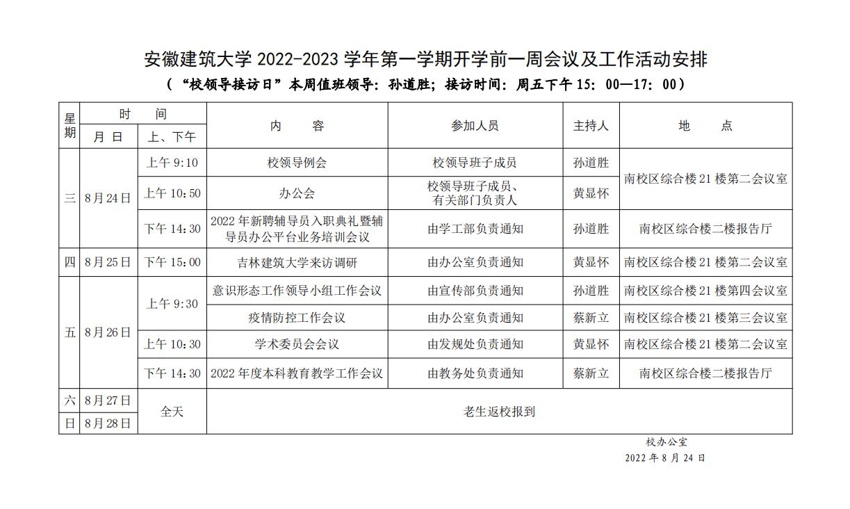 安徽建筑大学2022-2023学年第一学期开学前一周会议及工作活动安排