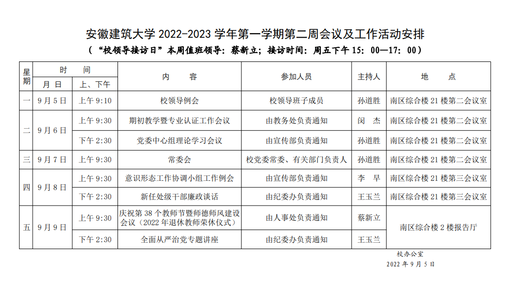 安徽建筑大学2022-2023学年第一学期第二周会议及工作活动安排