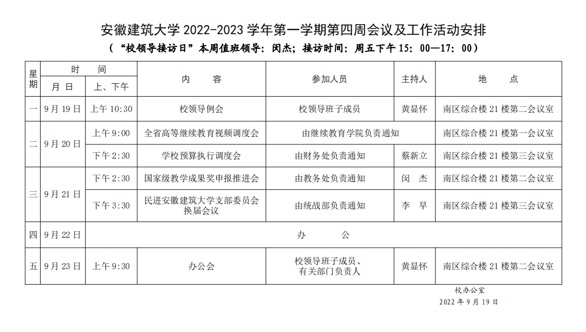 安徽建筑大学2022-2023学年第一学期第四周会议及工作活动安排