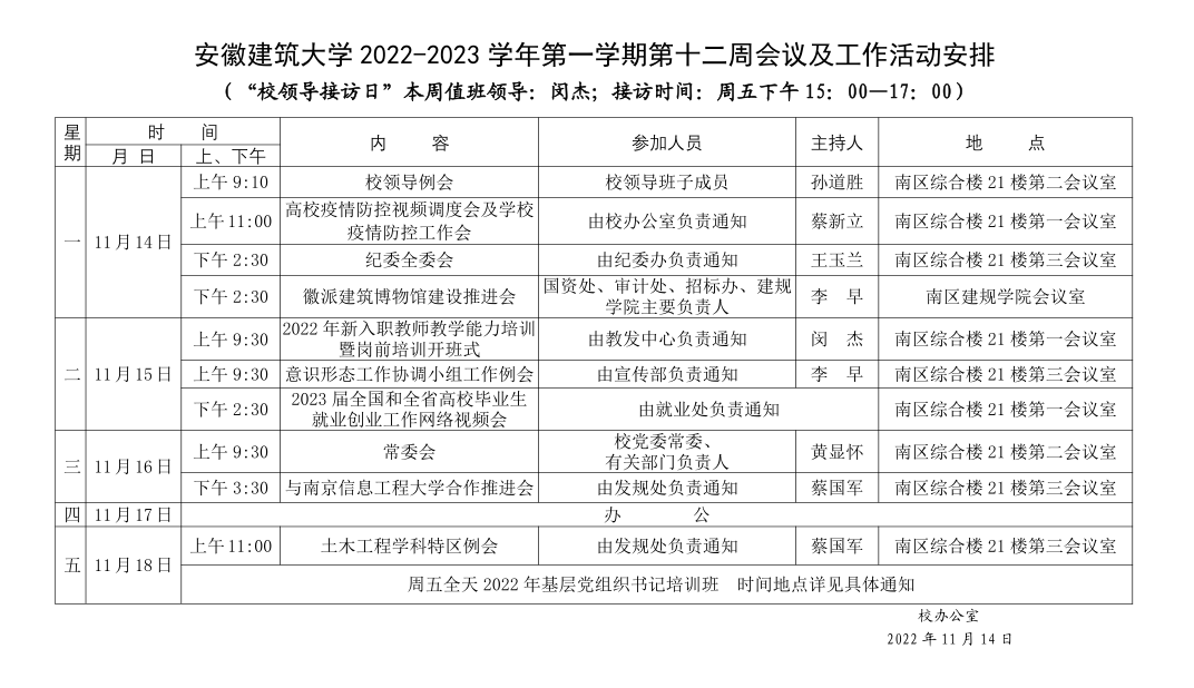 安徽建筑大学2022-2023学年第一学期第十二周会议及工作活动安排