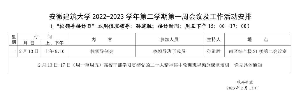 安徽建筑大学2022-2023学年第二学期第一周会议及工作活动安排
