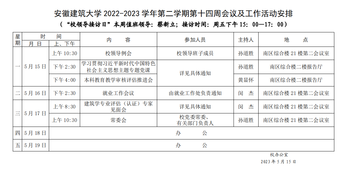 安徽建筑大学2022-2023学年第二学期第十四周会议及工作活动安排