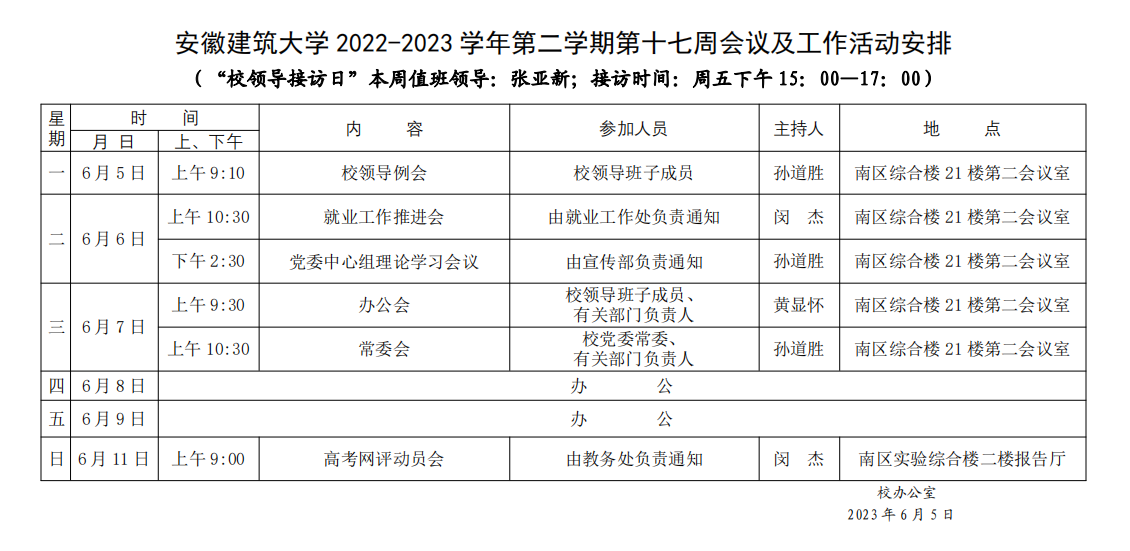 安徽建筑大学2022-2023学年第二学期第十七周会议及工作活动安排
