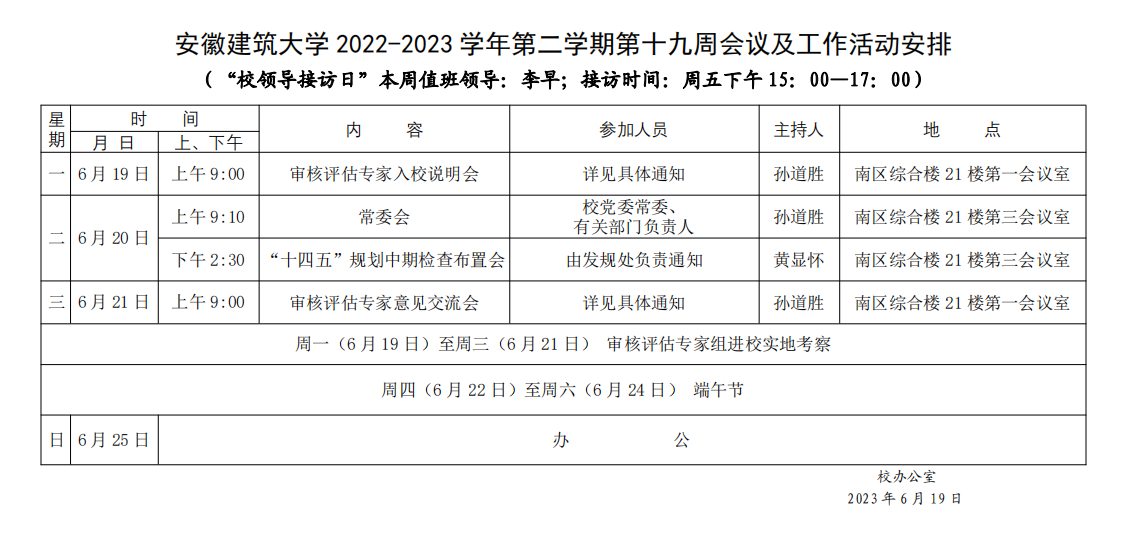 安徽建筑大学2022-2023学年第二学期第十九周会议及工作活动安排