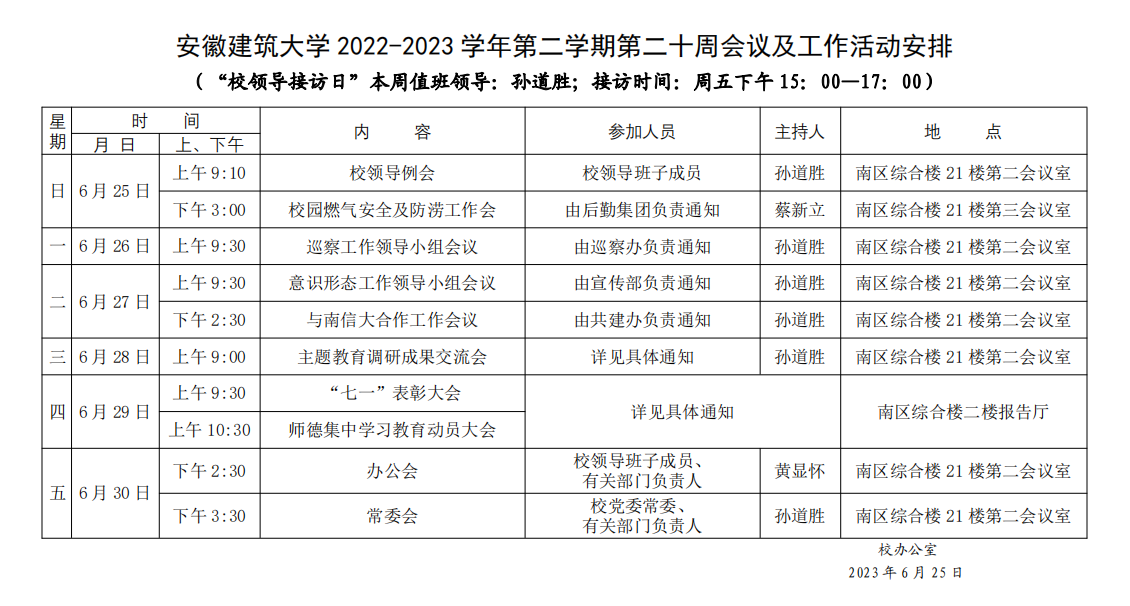安徽建筑大学2022-2023学年第二学期第二十周会议及工作活动安排