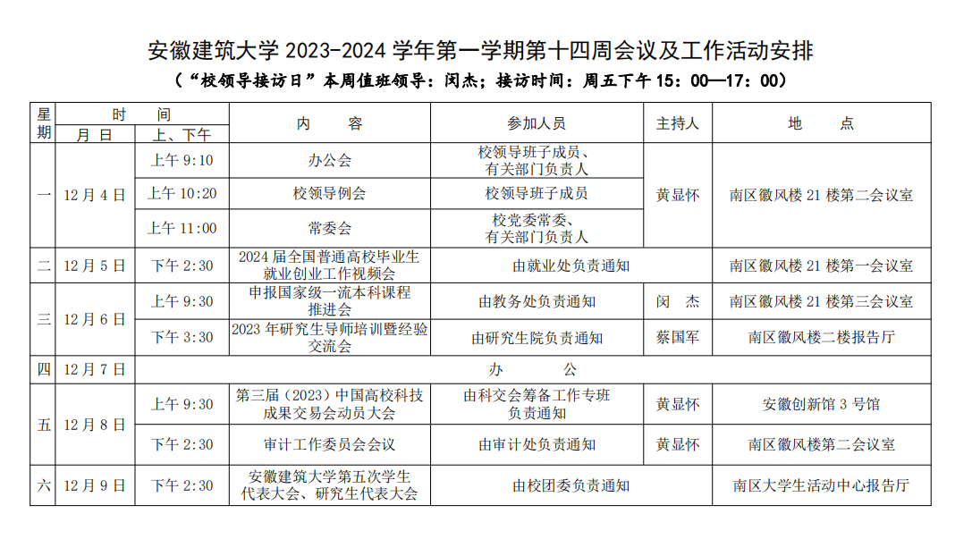 安徽建筑大学2023-2024学年第一学期第十四周会议及工作活动安排
