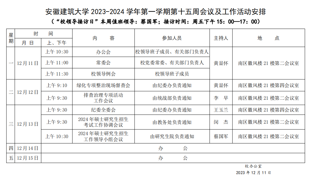 安徽建筑大学2023-2024学年第一学期第十五周会议及工作活动安排