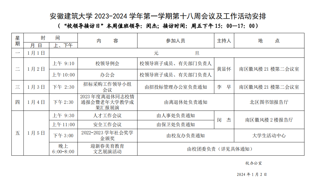安徽建筑大学2023-2024学年第一学期第十八周会议及工作活动安排