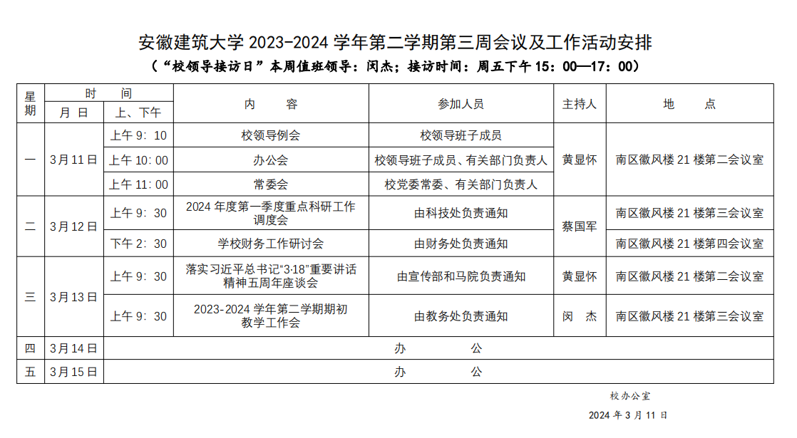 安徽建筑大学2023-2024学年第二学期第三周会议及工作活动安排