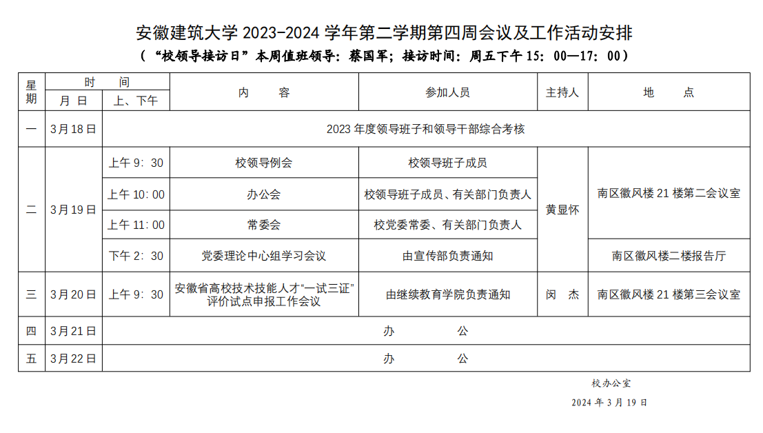 安徽建筑大学2023-2024学年第二学期第四周会议及工作活动安排