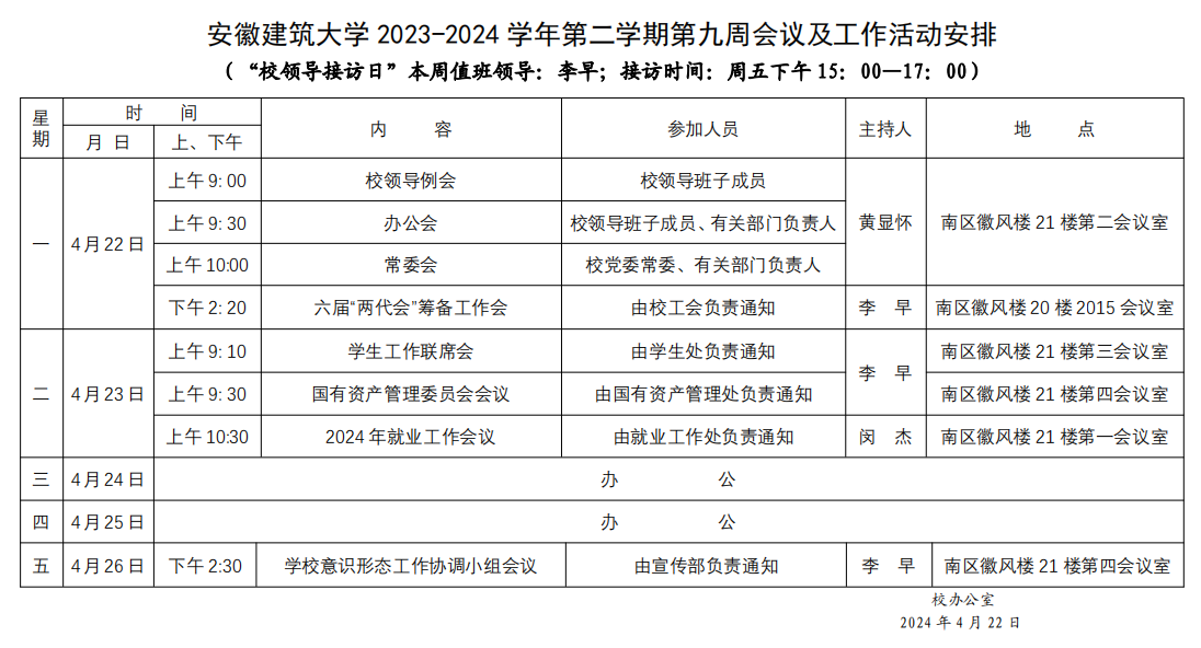 安徽建筑大学 2023-2024 学年第二学期第九周会议及工作活动安排