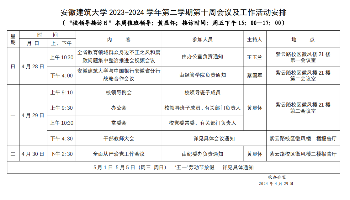 安徽建筑大学 2023-2024 学年第二学期第十周会议及工作活动安排