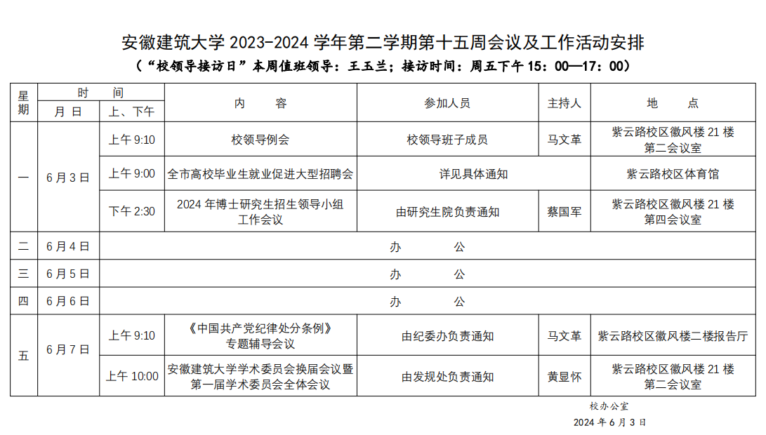 安徽建筑大学 2023-2024 学年第二学期第十五周会议及工作活动安排