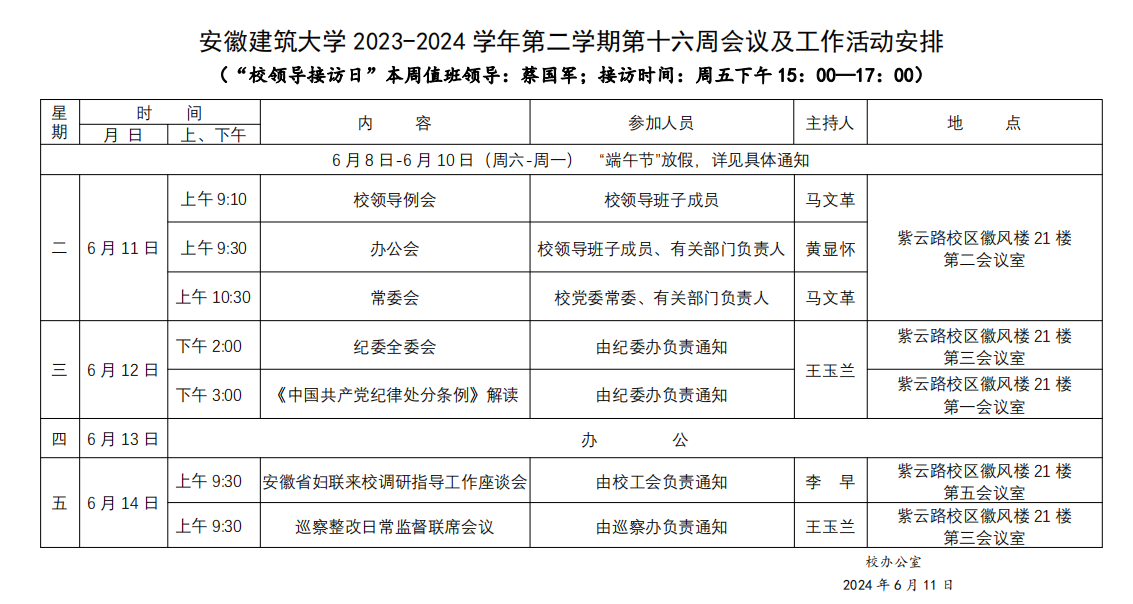 安徽建筑大学 2023-2024 学年第二学期第十六周会议及工作活动安排