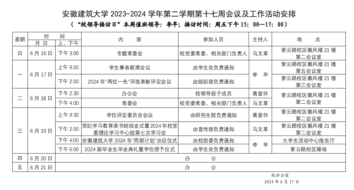 安徽建筑大学 2023-2024 学年第二学期第十七周会议及工作活动安排