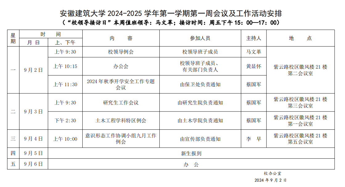 安徽建筑大学2024-2025学年第一学期第一周会议及工作活动安排