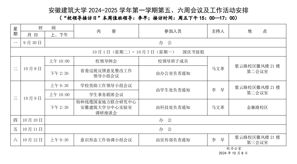 安徽建筑大学 2024-2025 学年第一学期第五、六周会议及工作活动安排
