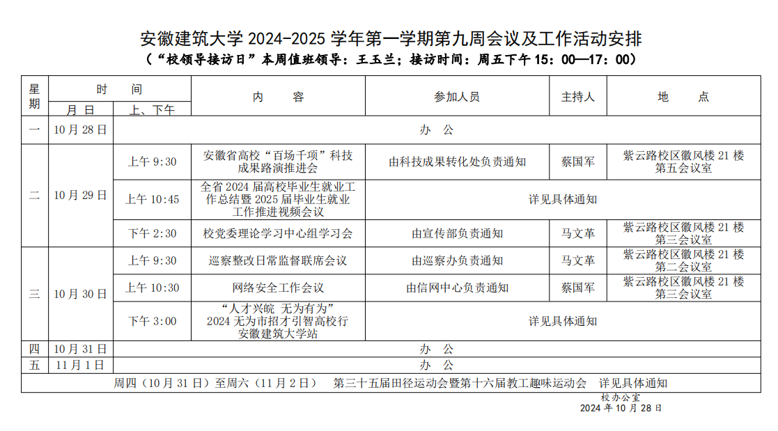 安徽建筑大学 2024-2025 学年第一学期第九周会议及工作活动安排