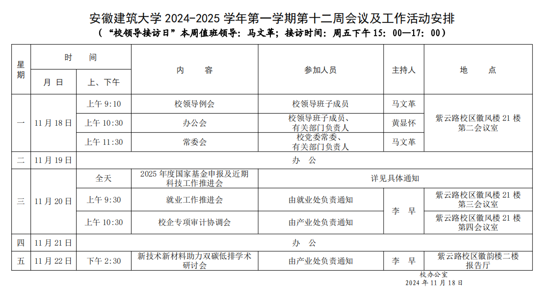 安徽建筑大学 2024-2025 学年第一学期第十二周会议及工作活动安排