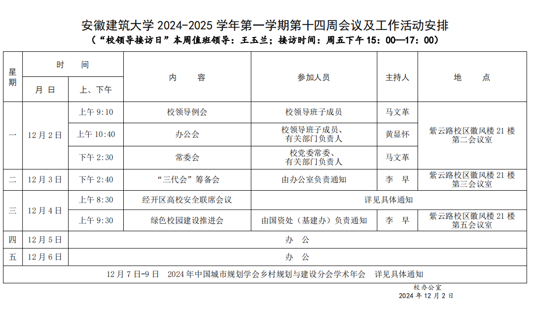 安徽建筑大学2024-2025学年第一学期第十四周会议及工作活动安排
