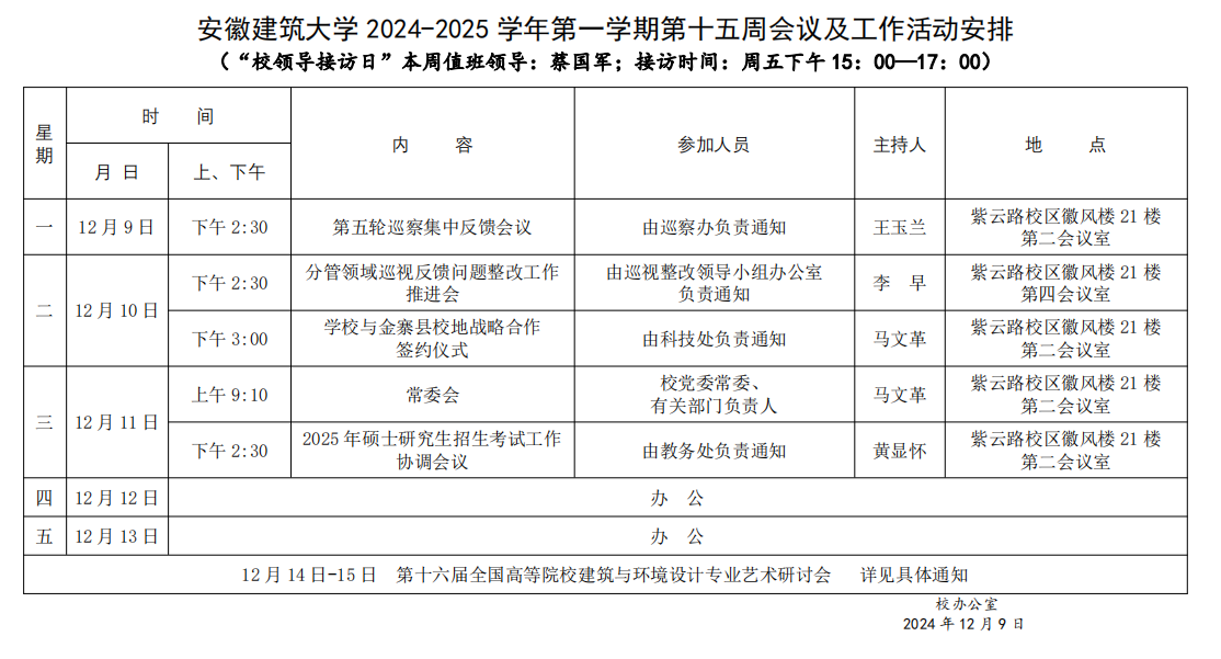 安徽建筑大学 2024-2025 学年第一学期第十五周会议及工作活动安排