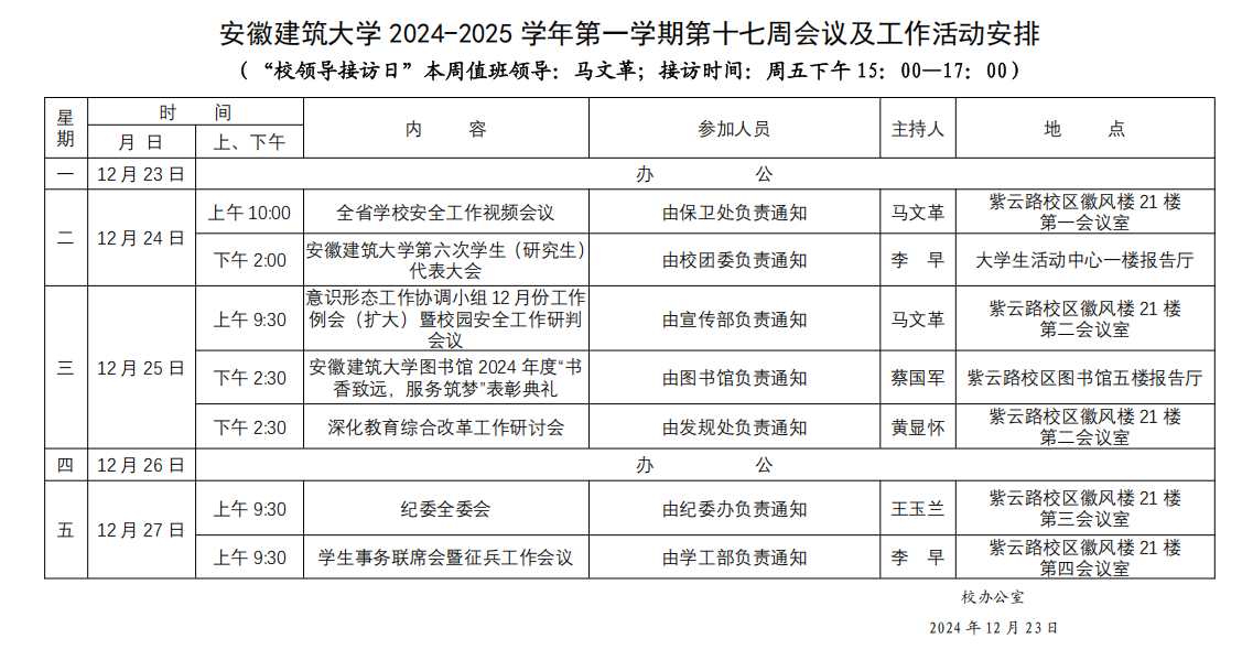 安徽建筑大学 2024-2025 学年第一学期第十七周会议及工作活动安排