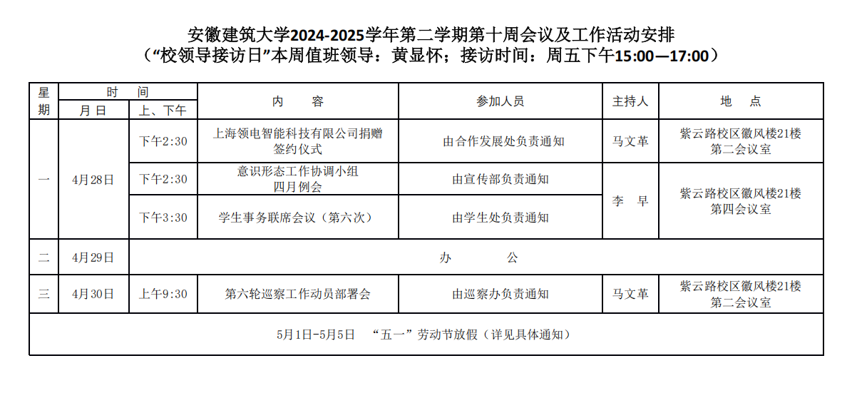 安徽建筑大学2024-2025学年第二学期第十周会议及工作活动安排