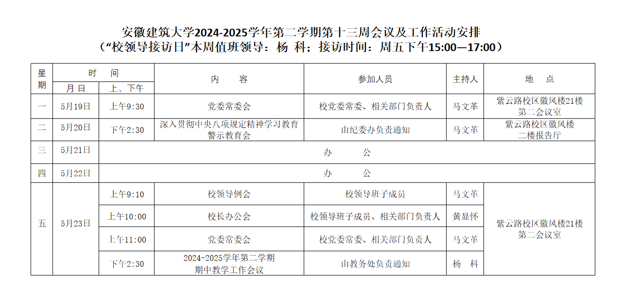 安徽建筑大学2024-2025学年第二学期第十三周会议及工作活动安排