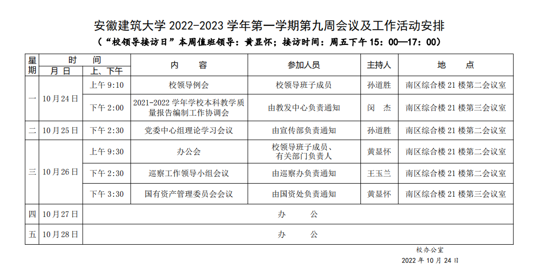 安徽建筑大学2022-2023学年第一学期第九周会议及工作活动安排