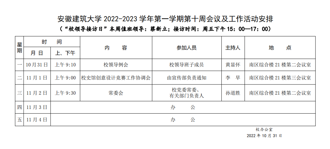 安徽建筑大学2022-2023学年第一学期第十周会议及工作活动安排