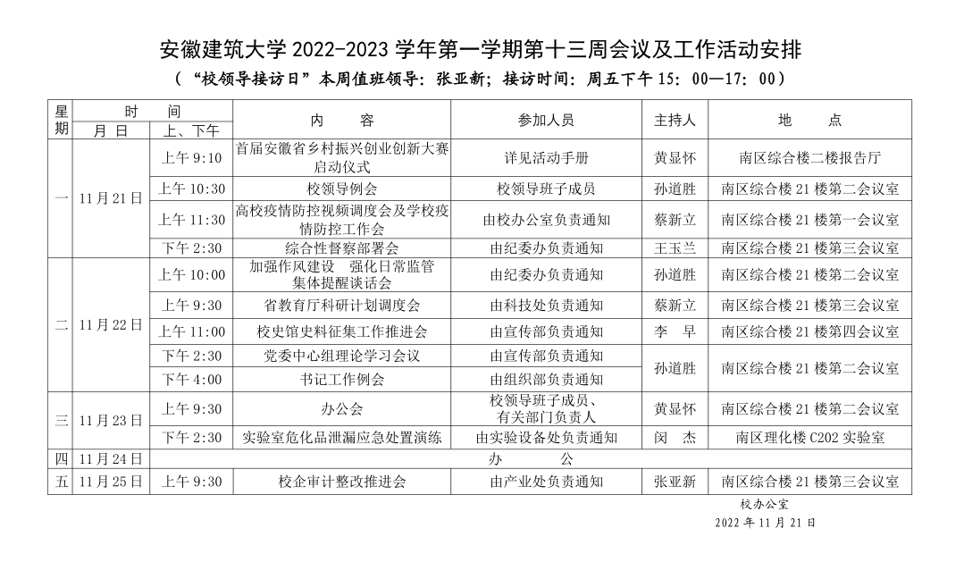 安徽建筑大学2022-2023学年第一学期第十三周会议及工作活动安排