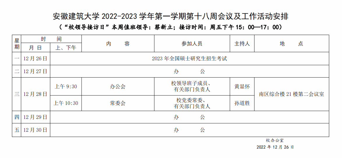 安徽建筑大学2022-2023学年第一学期第十八周会议及工作活动安排