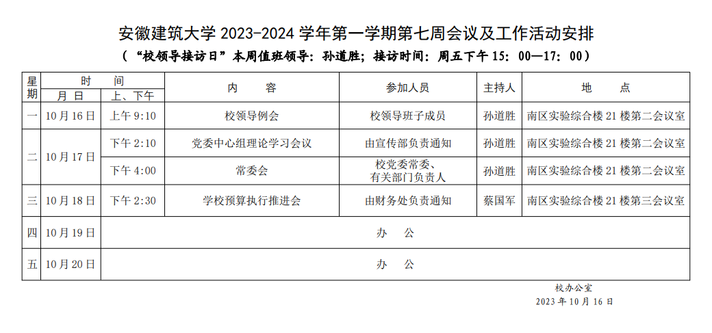 安徽建筑大学2023-2024学年第一学期第七周会议及工作活动安排