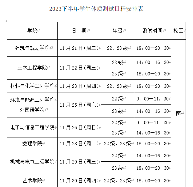 下半年学生体质健康测试工作将于11月下旬开始,请各学院大力宣传、积极动员并督促学生认真参加测试。