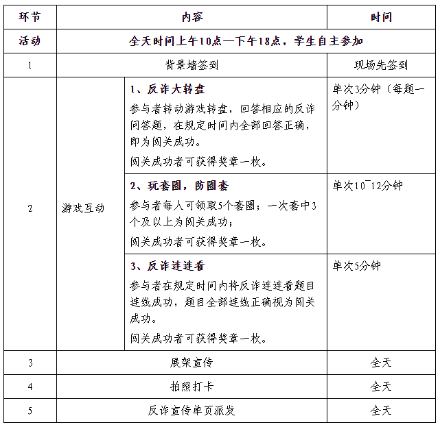 活动以互动体验进行反诈防骗宣传活动,每位同学领取集章卡方可参与游戏活动,每成功完成一个游戏,便获得相应奖章并兑换对应奖章的礼品。