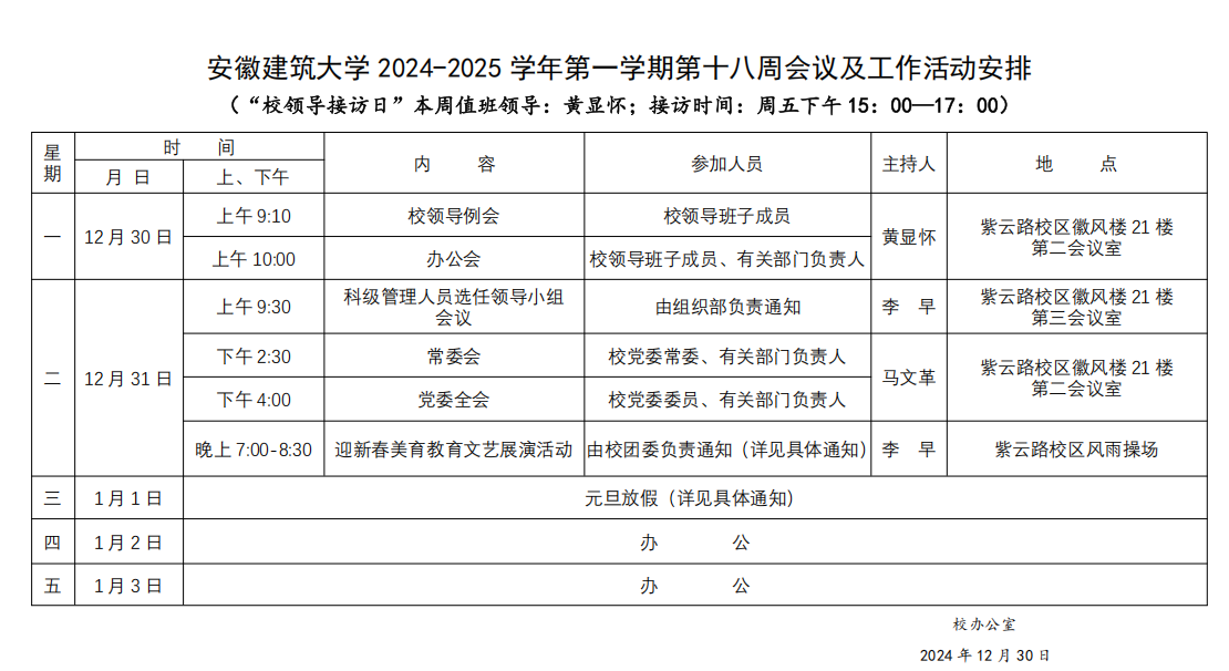 安徽建筑大学2024-2025学年第一学期第十八周会议及工作活动安排