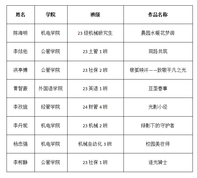根据学校《关于举办“最美劳动者”摄影征集活动的通知》有关要求,活动期间,在全校学生的积极参与和广泛支持下,拍摄了一批感染力强、教育性突出的摄影作品,活动实现了劳动教育宣传的目标,提升了学生自觉接受劳动教育的目的。党委宣传部联合教务处对投稿作品进行严格遴选,共选出8幅优秀作品。