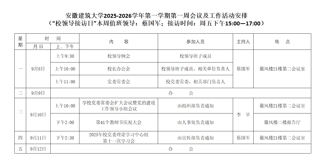 安徽建筑大学2025-2026学年第一学期第一周会议及工作活动安排