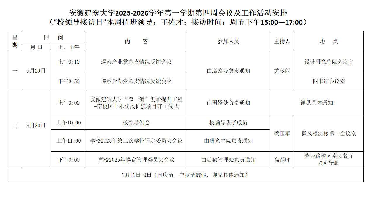 安徽建筑大学2025-2026学年第一学期第四周会议及工作活动安排