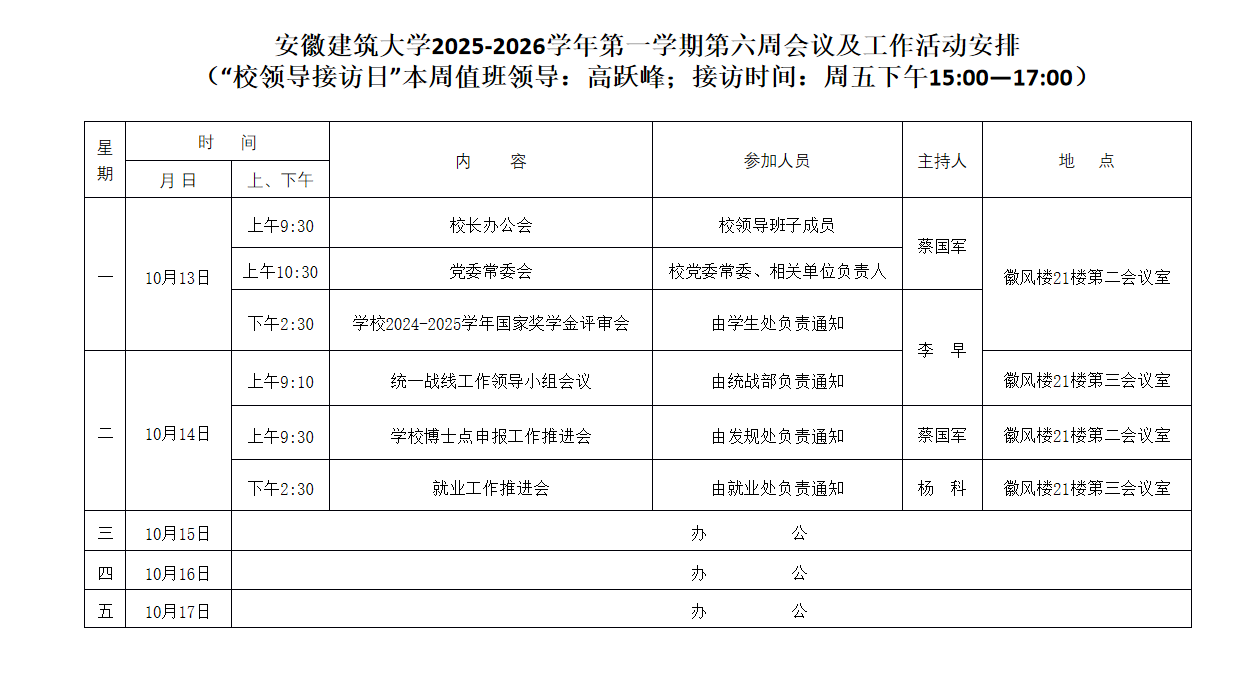 安徽建筑大学2025-2026学年第一学期第六周会议及工作活动安排