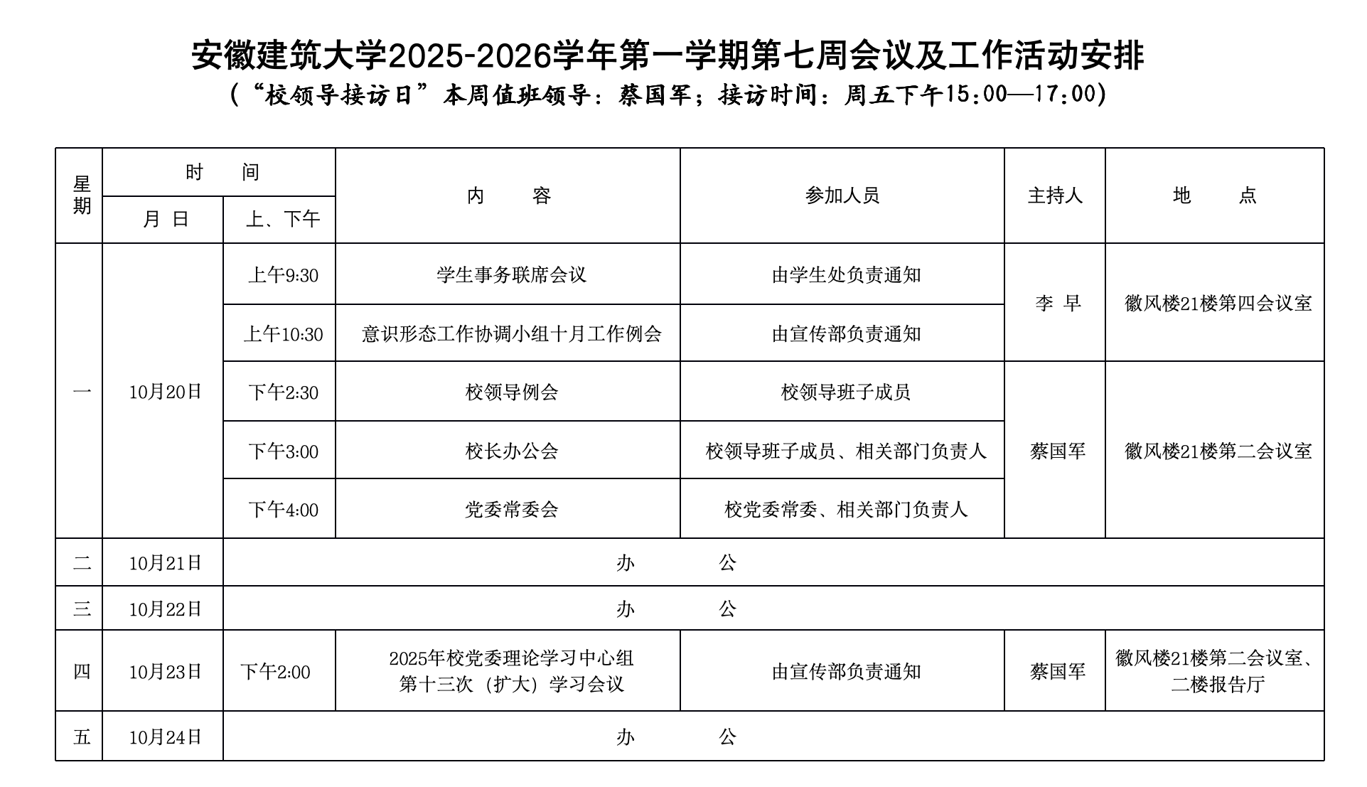 安徽建筑大学2025-2026学年第一学期第七周会议及工作活动安排