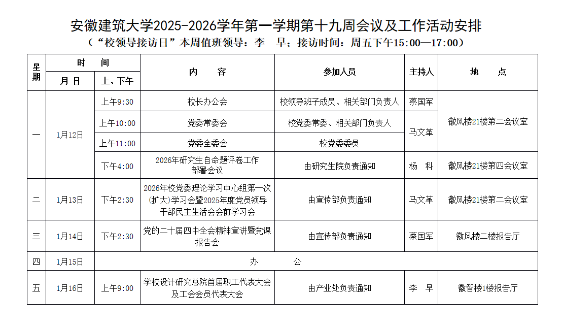 安徽建筑大学2025-2026学年第一学期第十九周会议及工作活动安排