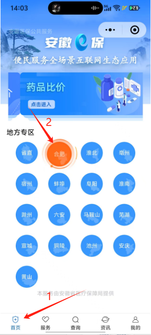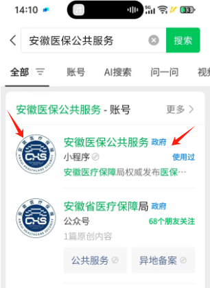 1.微信或支付宝搜索框,搜索小程序:安徽医保公共服务