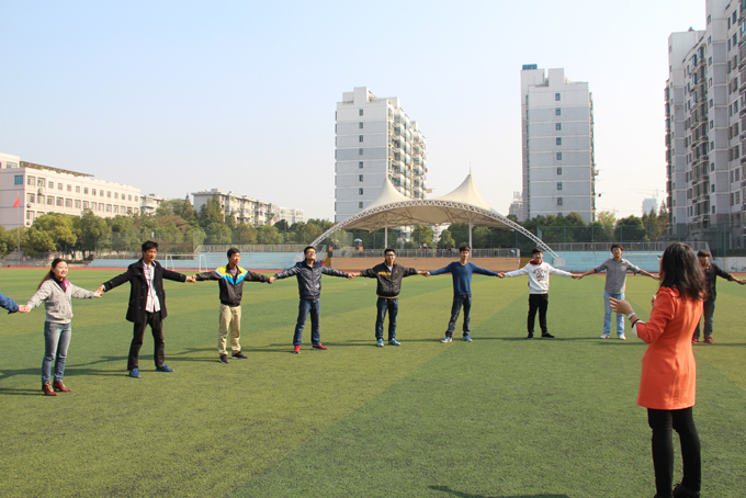 115上午,在北校区操场,艺术学院13级新生开展了一场主题为“有缘相聚,快乐启程”的户外团体辅导,活动的领导者是校大学生心理健康教育中心郑敏老师,辅导员观摩并积极参与到活动中。
