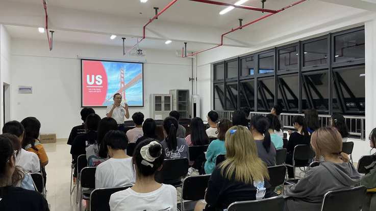 本网讯 9月24日晚,北京环球雅思合肥总校校长、我校95级校友余锦华为环境设计专业中外合作班的新生带来了一场别开生面的英语公益讲座,讲座在实训综合楼艺术学院四楼会议室进行。在此之前,余锦华已连续多年就英语学习为艺术学院学子传经送宝。