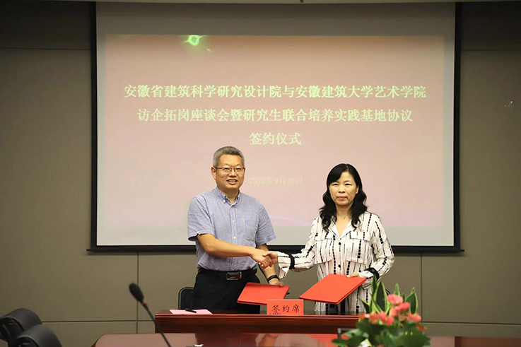 本网讯 9月29日下午,安徽建筑大学艺术学院与安徽省建筑科学研究设计院(以下简称省建科院)签订研究生联合培养实践基地协议。签约仪式在省建科院11楼会议室举行,省建科院副院长徐从广、人力资源部部长徐文正、经营管理部副部长陈琦、规划分院院长章慧明,环艺工作室主任李言天,安徽建筑大学艺术学院副院长邢瑜、党委副书记潘青,副院长黄朝晖、科研平台负责人黄成出席仪式。