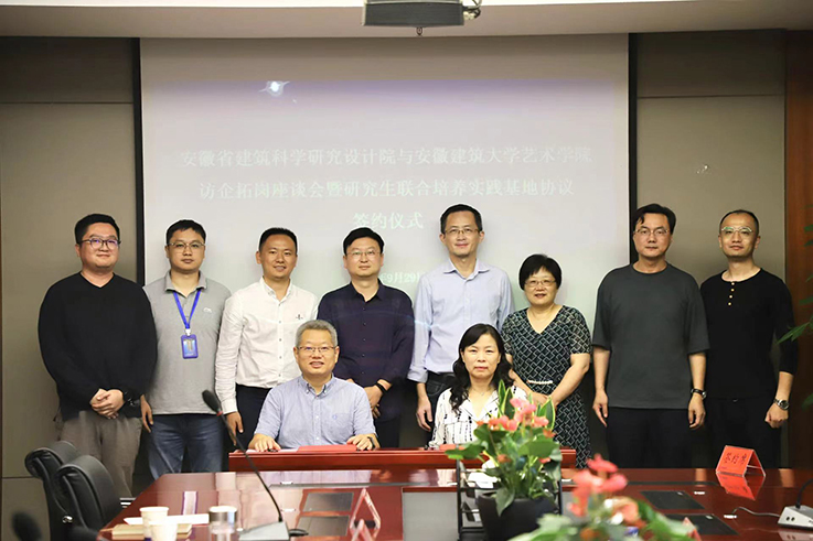 本网讯 9月29日下午,安徽建筑大学艺术学院与安徽省建筑科学研究设计院(以下简称省建科院)签订研究生联合培养实践基地协议。签约仪式在省建科院11楼会议室举行,省建科院副院长徐从广、人力资源部部长徐文正、经营管理部副部长陈琦、规划分院院长章慧明,环艺工作室主任李言天,安徽建筑大学艺术学院副院长邢瑜、党委副书记潘青,副院长黄朝晖、科研平台负责人黄成出席仪式。