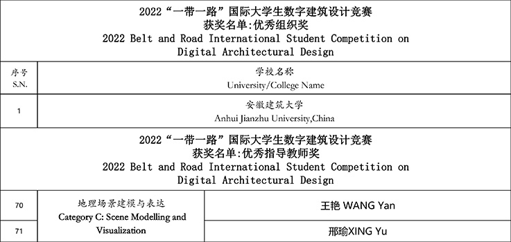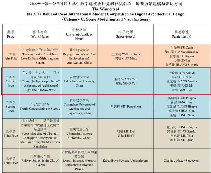本网讯 10月28日,由联合国教科文组织支持、“一带一路”建筑类大学国际联盟发起、北京建筑大学主办的2022“一带一路”国际大学生数字建筑设计竞赛结果揭晓,艺术学院研究生、本科生共同创作的《“色、质、形、名”—百年建筑光影漫步》在地理场景建模与表达方向荣获二等奖,安徽建筑大学荣获“优秀组织奖”,邢瑜、王艳老师获得“优秀指导教师”荣誉称号。