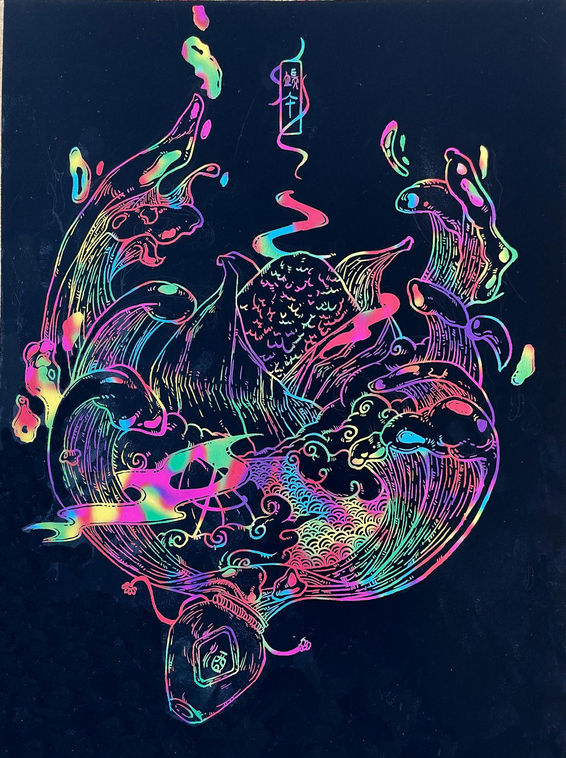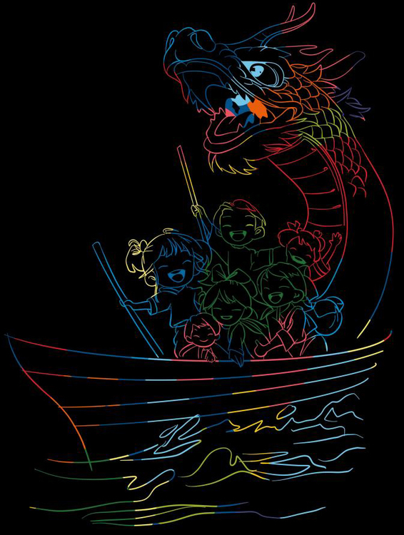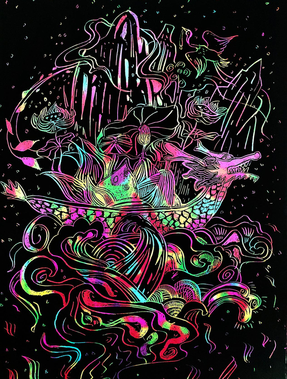 20级环境设计专业杨贤浩刮画作品《“粽”得功成》以龙舟为主要元素,将粽子作为点缀其中,缤纷的波浪与高山、青荷、野鹤、绿叶相融合,通过缤纷绚丽的色彩构成效果,将端午节的构成元素与文化内涵生动地表达了出来。