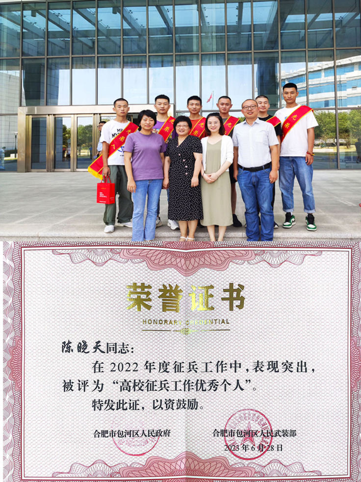 艺术学院本科生男女比例约3:7,男生占比低、人数少。在日常征兵工作中,不仅对毕业班同学“靶向”动员,也结合新生军训、校运动会、家校沟通、助学贷款办理、日常谈心谈话等时间节点对低年级有潜力同学开展摸底,发现“好苗子”,将征兵工作抓在经常,做在日常。学院2021至2023年连续三年200%、133%、100%完成征兵征集任务数,陈晓天获2022年度高校征兵工作优秀个人荣誉称号。